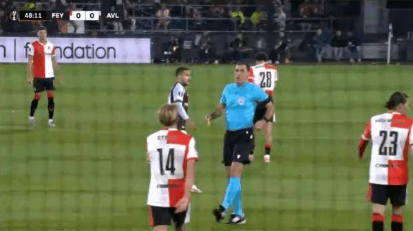 13' - 第1张黄牌,裁判出示了本场比赛的第一张黄牌,给了费耶诺德